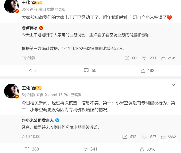 12月16号音讯,小米王化暗示“当天关系新闻,过程再次核查,信息子虚。第一:小米空调莫得专利侵权活动;第二:小米莫得因为专利侵权补偿的情况。”