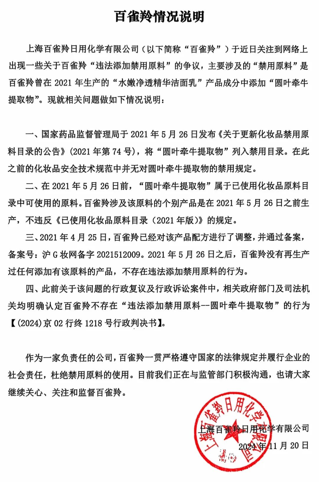 百雀羚官微20日上昼发情况讲解称,不存在罪人添加禁用原料当作。